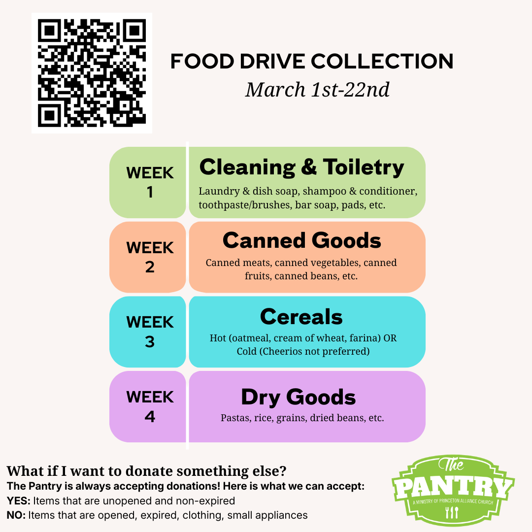 The Pantry at Princeton Alliance Church exists to improve the quality of life of families in need while pointing them to the hope and grace of Jesus. The Pantry offers supplemental groceries, personal care, baby care and domestic items through an online ‘shop-with-points’ system. Fresh produce and eggs are available through our church garden and relationships with local food banks. Along with the needed food comes encouragement and accountability.